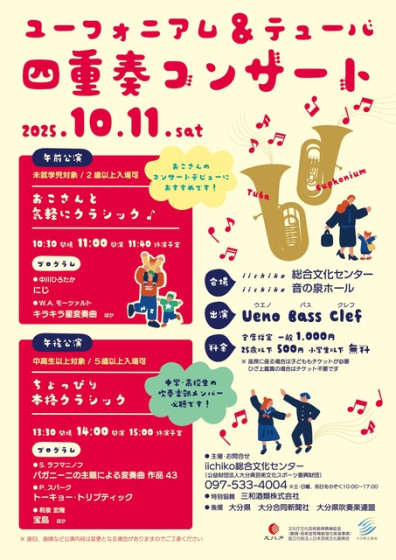今回は、ユーフォニアムとテューバだけでお届けするとても珍しいコンサートを開催。大きな楽器が奏でるのは、どんな音?iichiko音の泉ホールで体感してみよう!!出演:Ueno Bass Clef(ユーフォニアム:佐藤采香、山崎由貴、テューバ:石丸菜菜、芝 宏輔)。曲目:午前 中川ひろたか/にじ ほか、午後 P.スパーク/トーキョー・トリプティック、和泉宏隆/宝島 ほか。