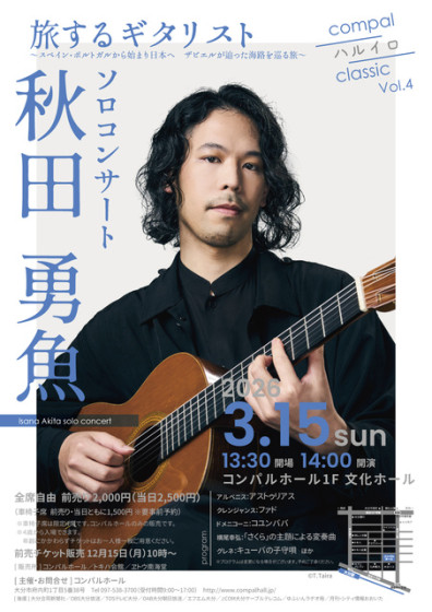 ~スペイン・ポルトガルから始まり日本へ ザビエルが辿った海路を巡る旅~ 世界を旅しながら活躍の場を広げる秋田勇魚。自由かつ豊かな感性で奏でるクラシックギターを楽しもう。