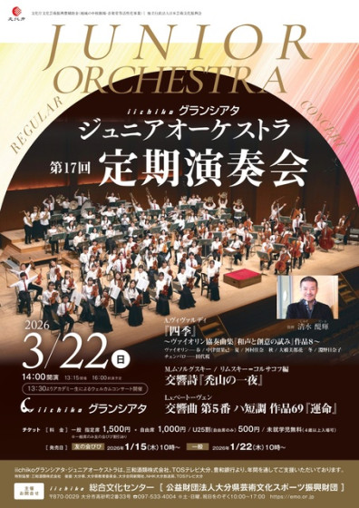 iichikoグランシアタで開催される定期演奏会。指揮:清水醍輝。ヴァイオリン:中津留果己、河村佳奈、大橋美都花、淵野日奈子。チェンバロ:田代 桜。チェロ:龍野しずく。曲目:ヴィヴァルディ/『四季』~ヴァイオリン協奏曲集『和声と創意の試み』作品8~、ムソルグスキー:リムスキー=コルサコフ編/交響詩『禿山の一夜』、ベートーヴェン/交響曲第5番 ハ短調 作品69『運命』。 ※4歳以上入場可