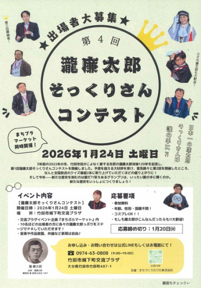 2022年の冬、竹田市民がこよなく愛する先哲の瀧廉太郎没後120年を記念し、第1回瀧廉太郎そっくりさんコンテストを開催。予想を超える大好評を受け、意気揚々と第2回を開催したところ、なんと全国放送のクイズ番組2本に取り上げられるほどの盛り上がりに! そして今回も…新たな歴史を刻むのは誰だ?! 栄えあるグランプリは、いったい誰の手に輝くのか。まちぷらマーケット内で開催。