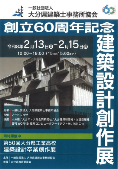 内容:(一社)大分県建築士事務所協会は、昭和51年から大分県内で学ぶ建築学生を対象に、建築を通じて夢を想像させ、また、建築技術者として将来の夢を育んでもらうことを目的に 「設計創作展(設計コンペ)」を開催。60周年を記念とした今回は、「大分のまちを元気にする建築」をテーマに、大分県で学ぶ建築学生(高校・高専・専修・短大・大学・大学院)、大分県で働く若手建築家(45歳以下)を対象に公募展を行う。