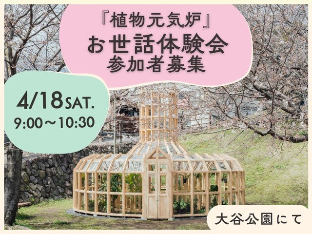 2024年にアーティスト栗林 隆が制作した植物園型アート作品「植物元気炉」の植物のお世話を体験できるイベントを開催。「植物元気炉」のお世話をサポートする「にわばんさん」も同時に募集。予約不要。手ぶらでOK。参加者にはプレゼントを贈呈。詳細はwebサイトを参照。