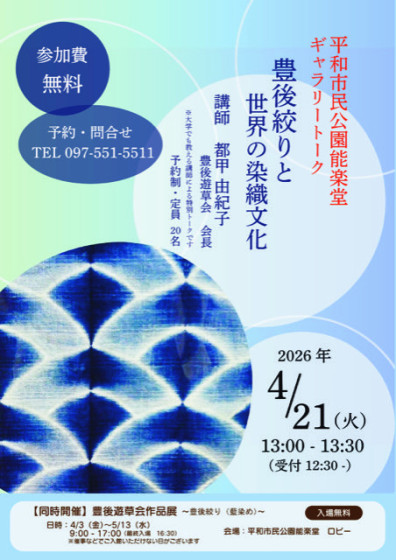「豊後絞り」とは大分(鶴崎地区)で発祥し江戸時代になると全国に広がった藍染の技法。幻の藍染となっていたが染色研究家の安藤宏子さん(大分市出身)が現代に甦らせた。安藤さんとその指導を受けたメンバーが「豊後遊草会」を結成。豊後遊草会会長 都甲由紀子氏を迎え豊後絞染めと世界の染色文化について講演。電話て予約受付(097-551-5511)。定員20名。